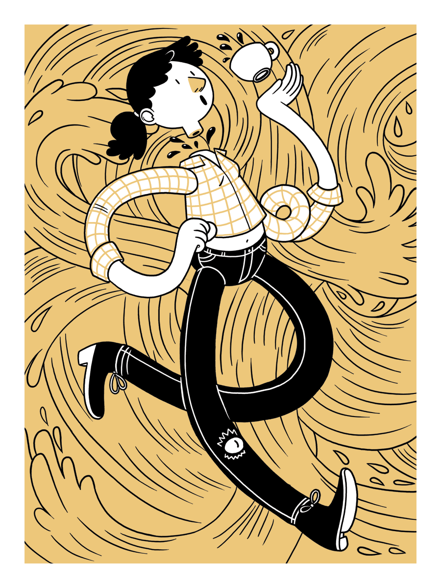 is a multi-talented artist who busies herself with game design, animation, and illustration projects for a variety of clients, contributing her talents to the animated series The Venture Brothers season 5 for Titmouse NYC. Her silkscreen print for Printmouse, called “Too Much Coffee,” a playful mix of cartoon aesthetics and macabre images.