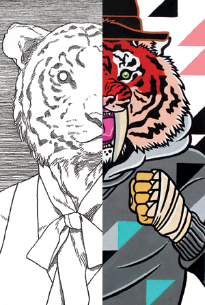 Douglas Ra is a New York based artist. He creates production art for web design, games, print, and television. Ra’s work often depicts animal heads on human bodies. In the artist’s own words, “Using animals can give characters universal appeal because they are racially and culturally unspecific… I hope to invite the viewer to watch the characters as one would watch animals on a safari show, to see how familiar the scene is but how foreign it is as well, to recognize their own city in it but experience another metropolis.”