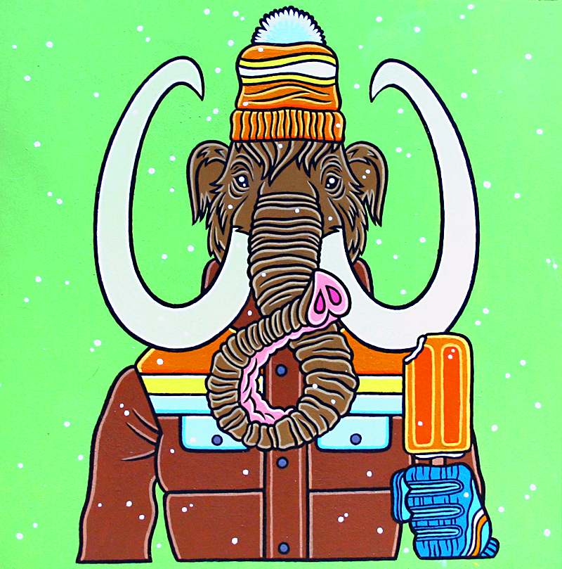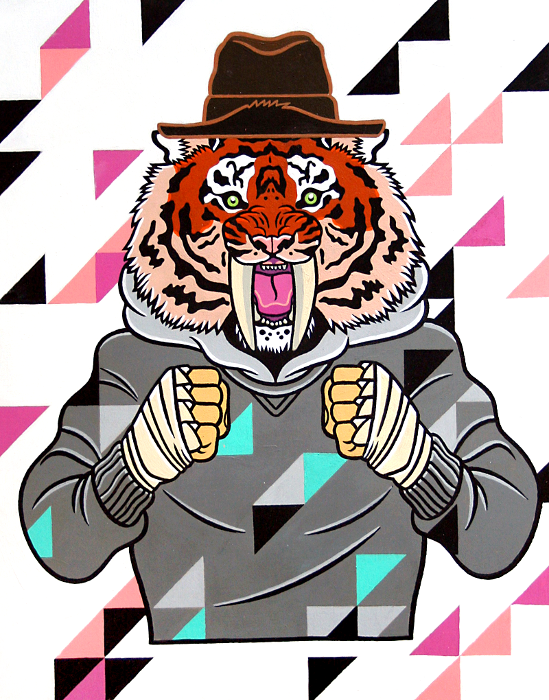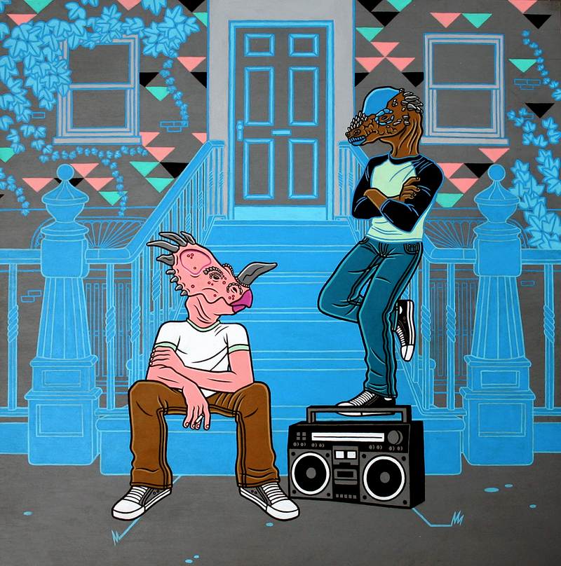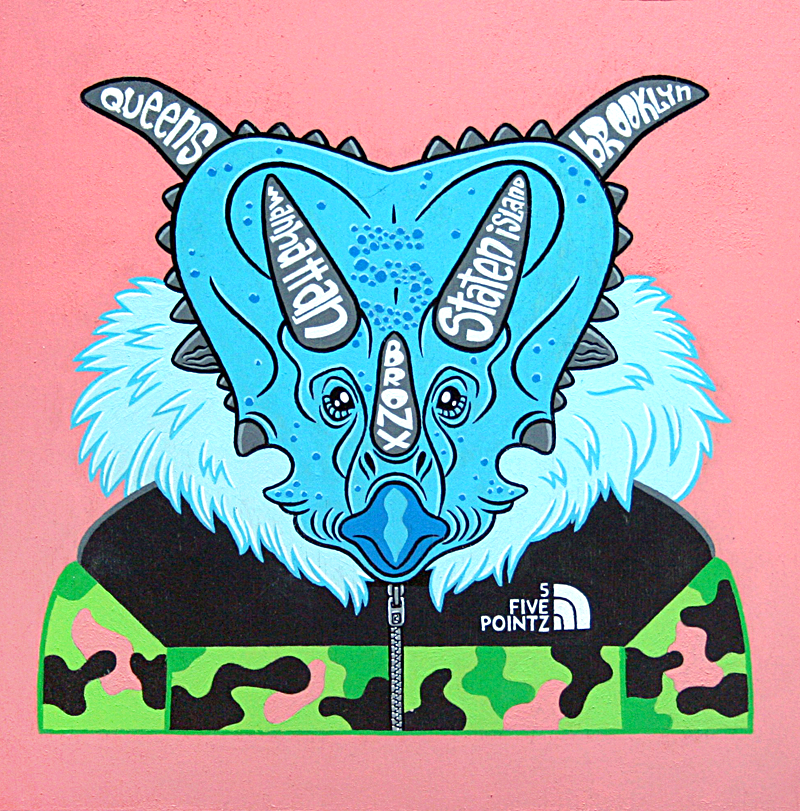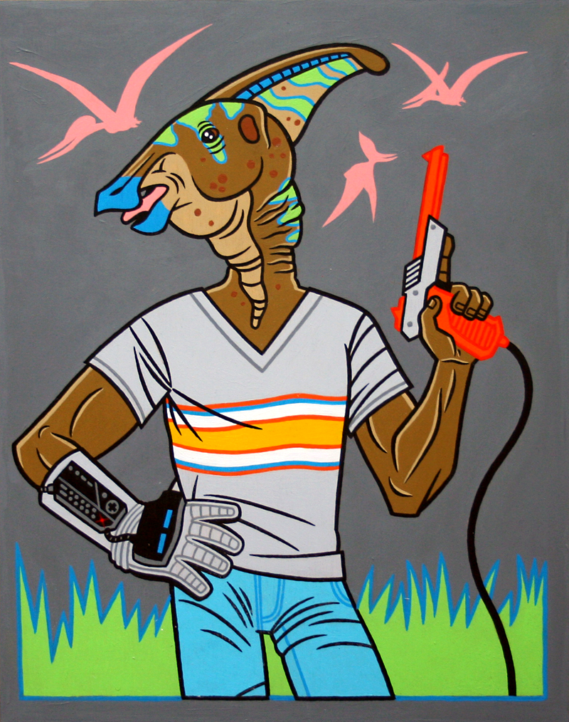 Jared Deal's opulent acrylic paintings draw upon anthropomorphism from a different source. Growing up in woodsy Delaware, nature had a profound effect on the artist. His work often involves a hybrid of three things; a childhood attachment to animals, the influence of living nearly 20 years in New York City, and the artist's career as an animation director. Deal's work is tongue-in-cheek joyful, often incorporating graffiti, pop art, fashion, toys, street scenes, cartoonish characters, and animals that kinetically take on human form. In describing his painting series for Ra Deal, the artist explains, "I wanted to do something a little different for this show, focusing on animals that are now extinct. I put them in situations from the past, retro garb or holding retro props... lots of fun references to Mr. T, Sesame Street, Nintendo and Duck Hunt." |