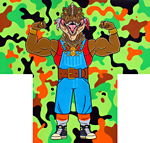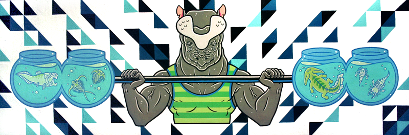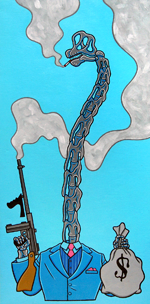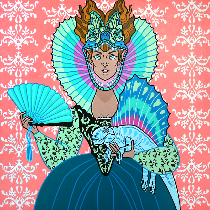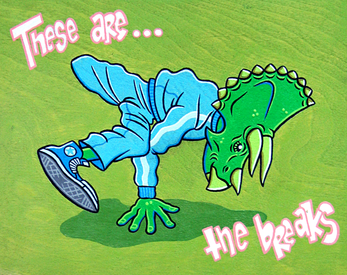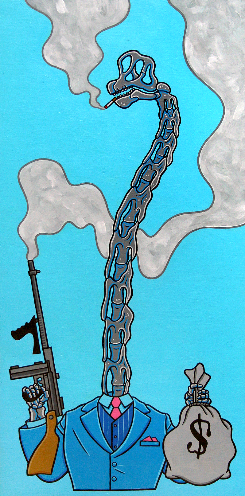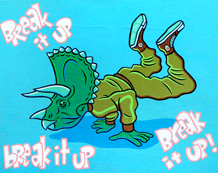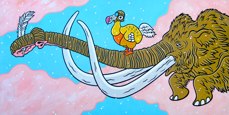 Jared Deal's opulent acrylic paintings draw upon anthropomorphism from a different source. Growing up in woodsy Delaware, nature had a profound effect on the artist. His work often involves a hybrid of three things; a childhood attachment to animals, the influence of living nearly 20 years in New York City, and the artist's career as an animation director. Deal's work is tongue-in-cheek joyful, often incorporating graffiti, pop art, fashion, toys, street scenes, cartoonish characters, and animals that kinetically take on human form. In describing his painting series for Ra Deal, the artist explains, "I wanted to do something a little different for this show, focusing on animals that are now extinct. I put them in situations from the past, retro garb or holding retro props... lots of fun references to Mr. T, Sesame Street, Nintendo and Duck Hunt." |
