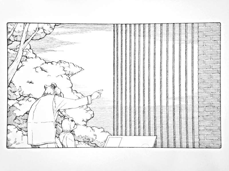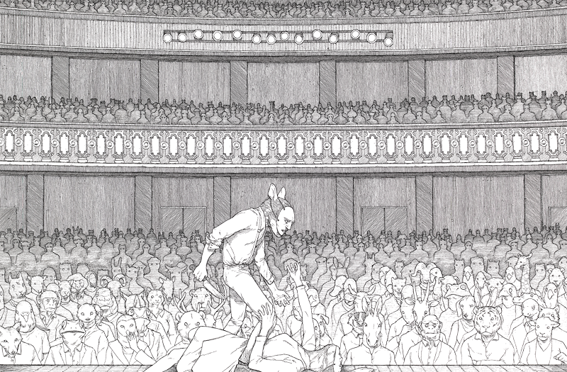 Douglas Ra's work owes much to growing up in Queens, NY. His drawings are meticulously contoured with thin ink lines, vacillating between portrayals of mundane repetition and chaotic violence in a way that is idiosyncratic to urban life. Ra populates his scenes with anthropomorphic characters -- swapping out human heads for animal ones -- a playful and fanciful element that frees him to satirize city life without directly evoking ideas of race or morality. In the artist's own words, "I didn’t want to draw scenes where a viewer would be fixated on what kind of person was portrayed, what was the color of their skin, whether they looked like someone... violence looks extremely odd and unfamiliar when inflicted on a horse by a pig with a stick... animals look strange when they wear other furs, and stranger when they don human-masks for costumes."